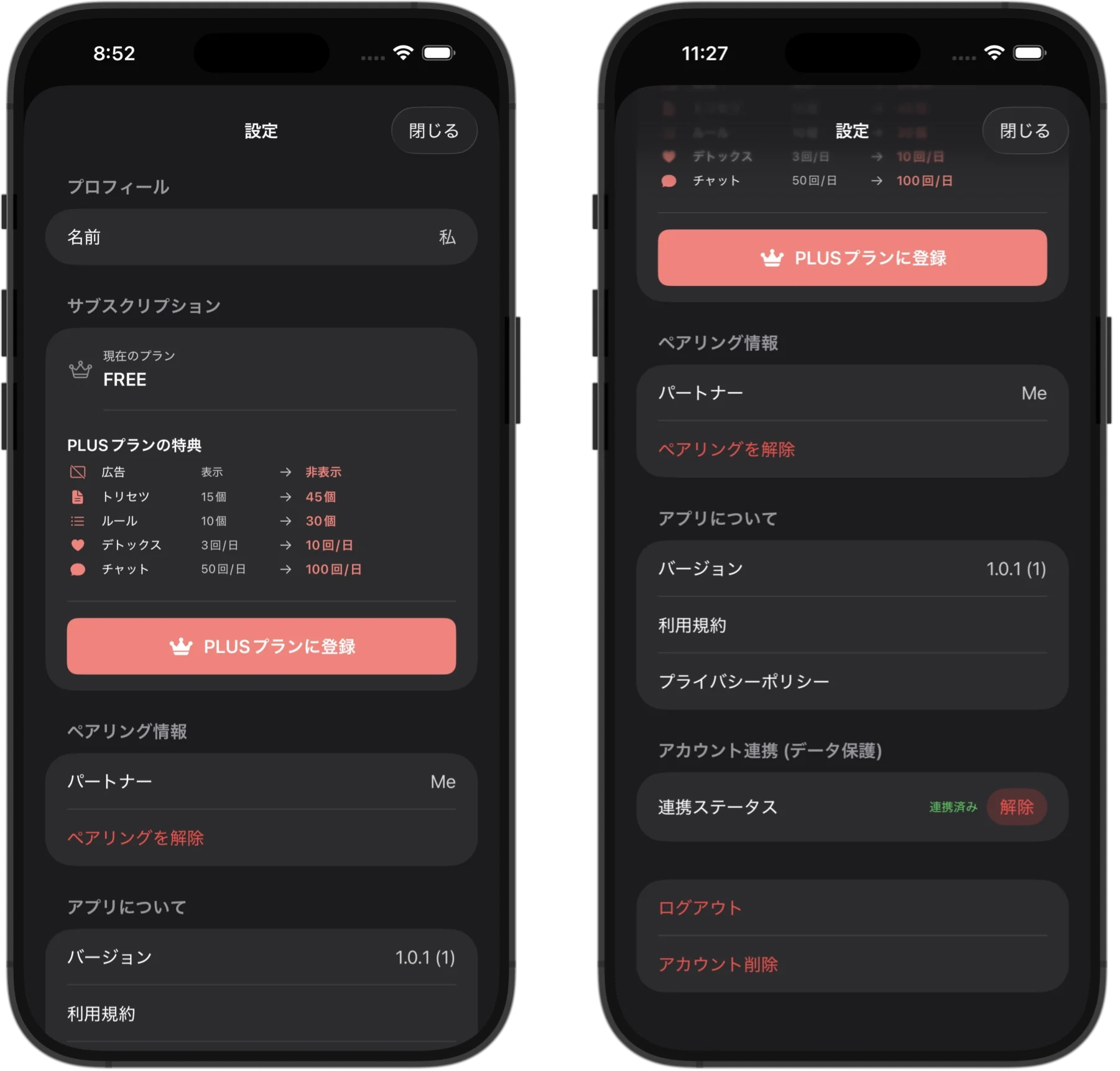 ※PLUSプランはどちらかひとりが加入することでふたり分適用となります。アカウント連携・ログアウト