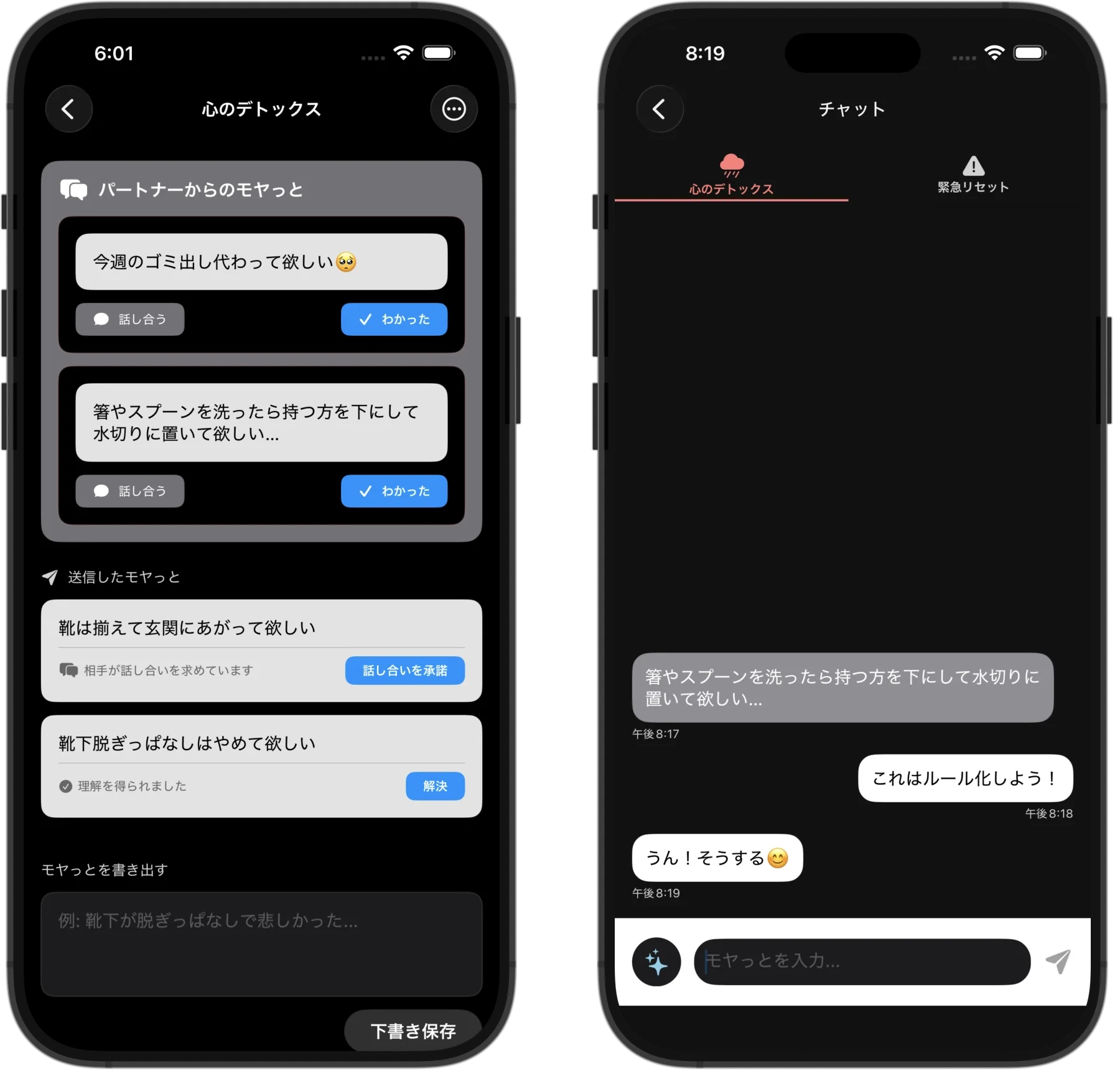 ホーム画面では、「今の気分」の表示の他に、「ふたりのトリセツ」「ふたりのルール」「心のデトックス」「話し合い部屋」「設定」と、5つの画面へのリンクがあります。